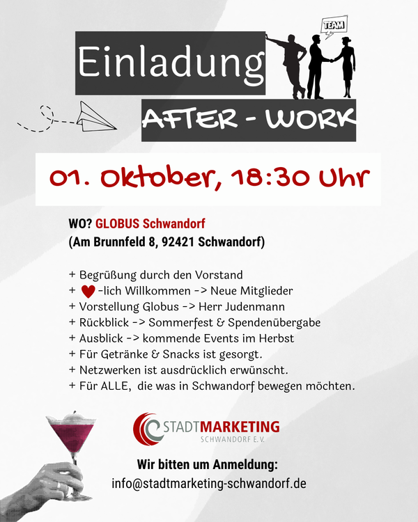 Am Dienstag, den 01. Oktober 2025, laden wir um 18:30 Uhr herzlich zu unserem After Work im Globus Schwandorf ein.
